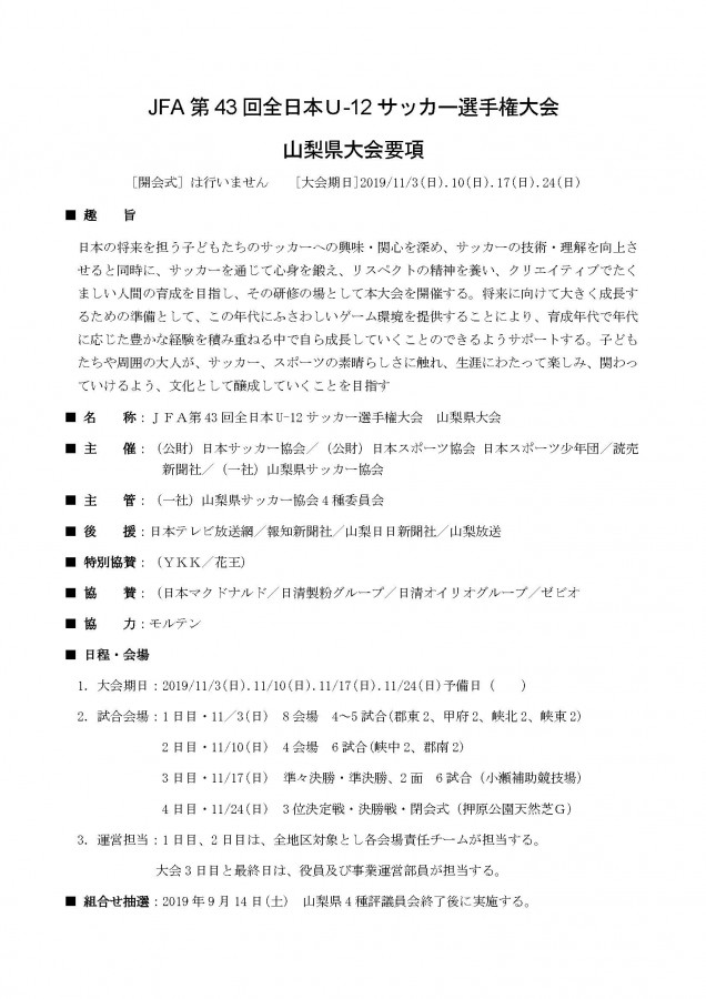 JFA第43回全日本U-12サッカー選手権大会山梨県大会要項を更新しました。