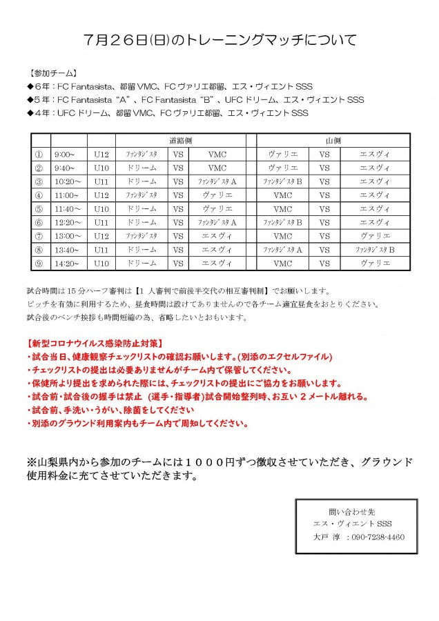 7/26 トレーニングマッチタイムスケジュールを更新しました。